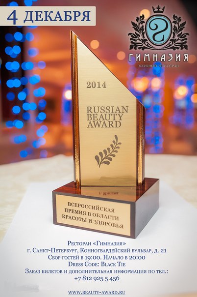 04 декабря 2014 года в Санкт-Петербурге состоится одно из самых ожидаемых событий в индустрии красоты и здоровья этого года ежегодная Всероссийская премия в области красоты и здоровья Russian Beauty Award 2014